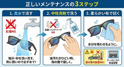 偏光グラスにとって、海辺での使用は「塩分」「砂」「皮脂」という三大天敵にさらされる過酷な状況です。特に塩分を放置すると、レンズのコーティングを傷めるだけでなく、金属パーツの腐食の原因にもなります。釣行後は以下の手順で、優しくいたわってあげましょう。