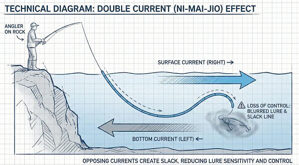 この場合、ラインが大きく孕んでしまい、水中ではジグが正しく動いていません。ルアーから伝わる情報が「不明瞭」だと感じたら、それは潮目としての機能が不十分なサインです。執着しすぎず、より潮が素直に動いているエリアへの移動、あるいはレンジの変更を即座に判断すべきです。
